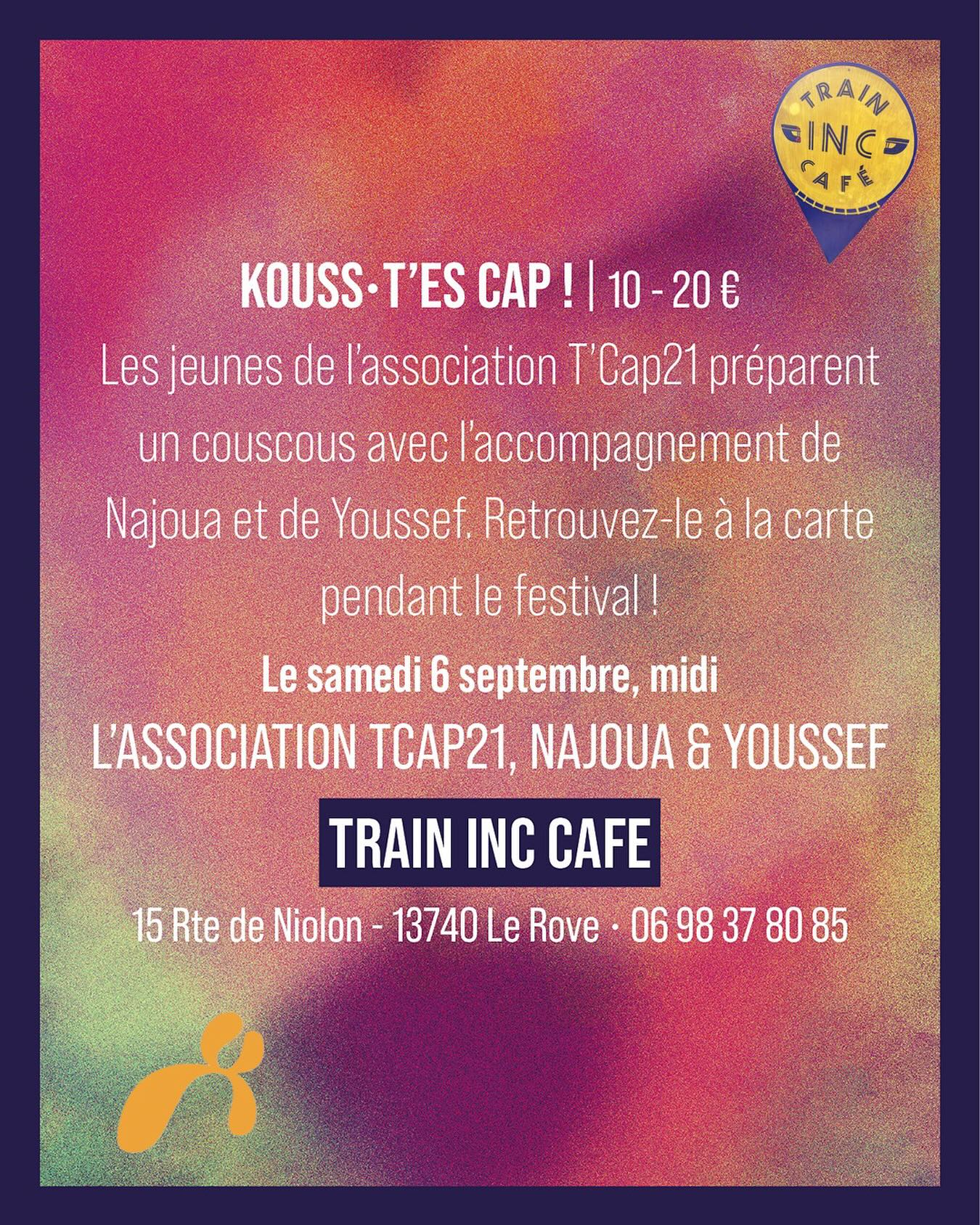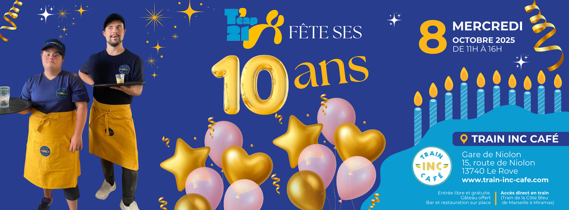 Actualité du Train Inc Café Il n'y a pas d'événements à venir pour le moment Événements passés 08 octobre Anniversaire 10 ans T’Cap 21Date 8 octobre 2025Heure 11h00 06 septembre Kouss.t’es Cap !Date 6 septembre 2025Heure 12h00 13 avril Flamenco Azul à NiolonDate 13 avril 2025Heure 11h00 22 novembre La compagnie L’Entaille en résidenceDate Nov 22 - 24, 2024Heure Événement sur toute la journée 04 octobre Apéro-tapas pour fêter les 9 ans de l’association T’Cap 21Date 4 octobre 2024Heure 19h00 18 avril Séminaire du collectif européen EU FOR TRISOMY 21Date Avr 18 - 21, 2024Heure Événement sur toute la journée 14 avril Toi sans qui le monde – Halte à NiolonDate 14 avril 2024Heure Événement sur toute la journée 01 avril Flamenco Azul – Escale à NiolonDate 1 avril 2024Heure 11h00 23 mars Déjeuner-tapas Serial GazellesDate 23 mars 2024Heure 11h30 10 décembre Un dimanche au Train Inc CaféDate 10 décembre 2023Heure Événement sur toute la journée 28 novembre Noël gourmand 2023Date Nov 28, 2023 - Jan 1, 2024Heure Événement sur toute la journée 28 octobre Concert chants italiensDate 28 octobre 2023Heure 19h00Prix Gratuit 23 octobre Résidence d’artistes avec La Cie TerracantoDate Oct 23 - 28, 2023Heure Événement sur toute la journée 08 juillet Sonate pour deux pianos – J. Brahms et S. RachmaninovDate 8 juillet 2023Heure 16h00 10 avril Festival Flamenco AzulDate 10 avril 2023Heure Événement sur toute la journéeOrganisateur Soléa